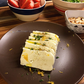 Let’s start with the star of the show – the cheese! If you’ve had halloumi before, you know you’re in for a treat. If you haven’t, oh boy are you about to meet a game changer! Start by cutting the halloumi into 1/4 inch slices – you’ll want 3-4 slices per person. Coat with olive oil (1-2 tsp), lemon zest, thyme and ground black pepper. Set aside.